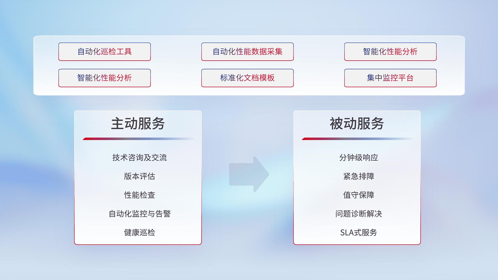 智能化工具和标准化文档,,,,保障服务质量,,提供主动服务(包含技术咨询、、版本评估、、、、性能检查、、自动化监控与告警、、健康巡检)和被动服务包含(分钟级响应、、、紧急排障、、值守保障、、、、问题诊断解决、、SLA服务)。。。