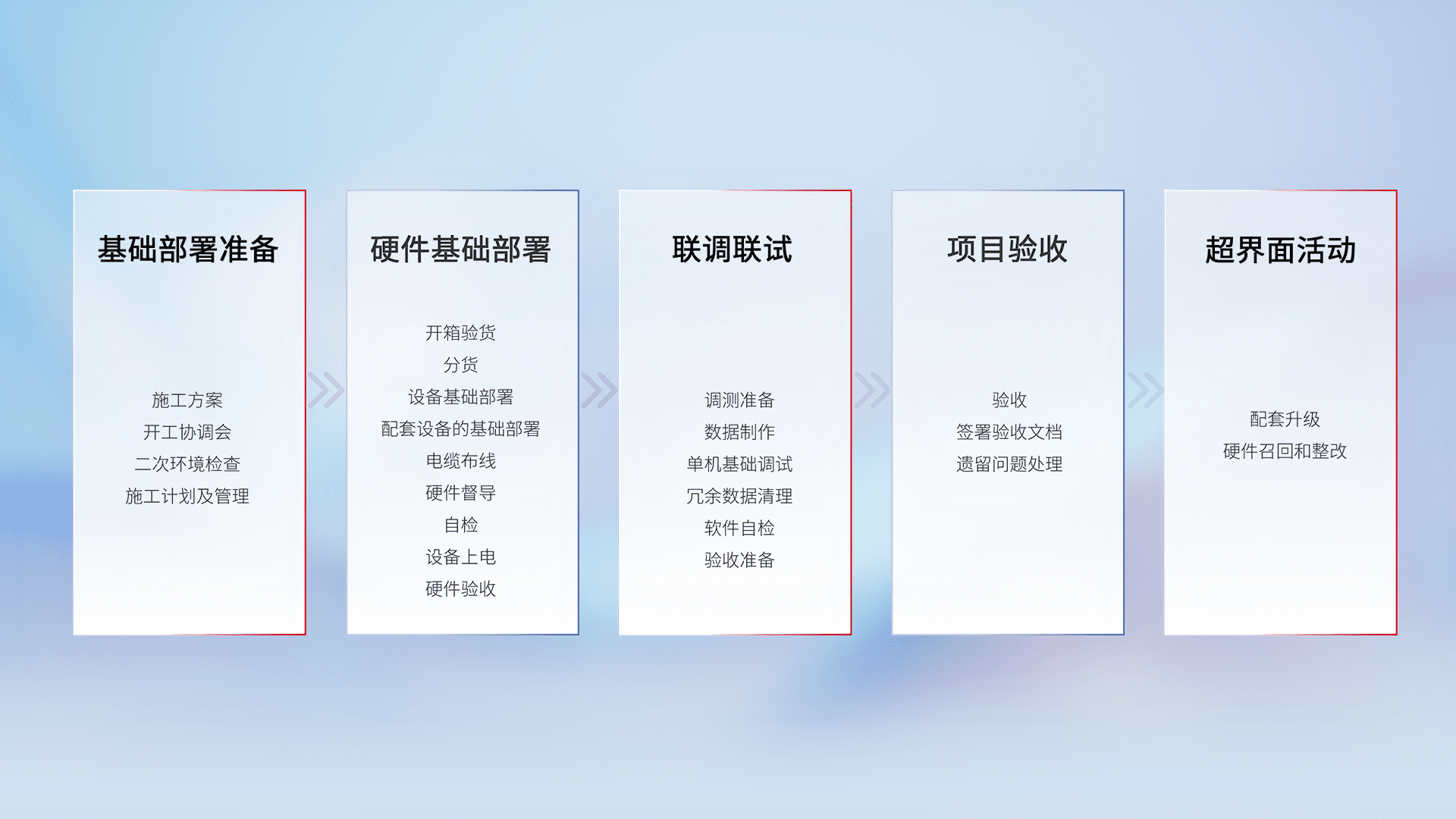 从基础部署准备、、、、硬件基础部署、、、、联调联试、、、项目验收、、、越界面活动的全过程可追溯,,,保证施工质量和进度。。。